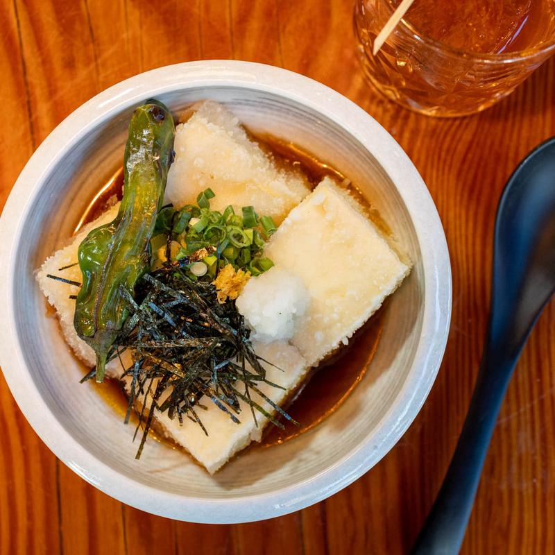 Fried tofu dipped with tempura sauce, radish, ginger, and kizami nori