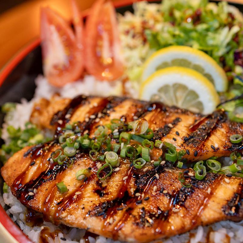 Rice donburi with salmon teriyaki, scallion, sesame seed, kizami nori, spicy aioli ,pink pickled ginger, and teriyaki sauce
